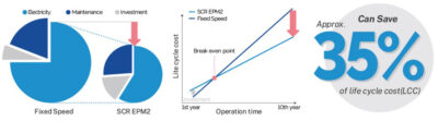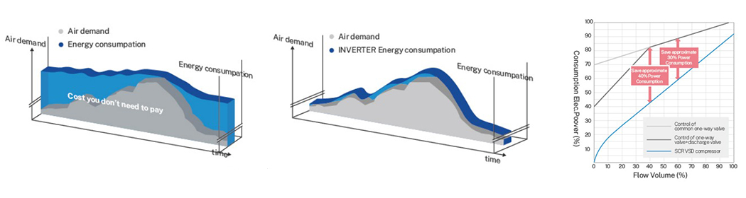 Компресор SCR може регулювати швидкість обертання компресора залежно від потреб заводського навантаження, яке змінюється щомиті за допомогою власно розробленого алгоритму. Таким чином, він може забезпечити точний об'єм і тиск, необхідні клієнту, та досягти максимальної економії енергії.