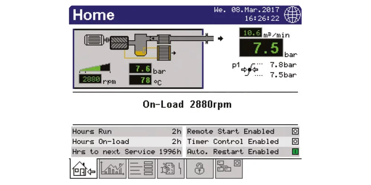 - Домашня сторінка, що пропонує миттєвий огляд стану компресора