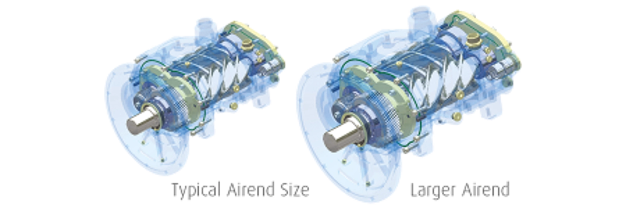 Моделі Е гвинтових компресорів серії L відрізняються збільшеним об'ємом компресорних головок та оптимізованою швидкістю ротора, що забезпечує економію електроенергії до 6%.