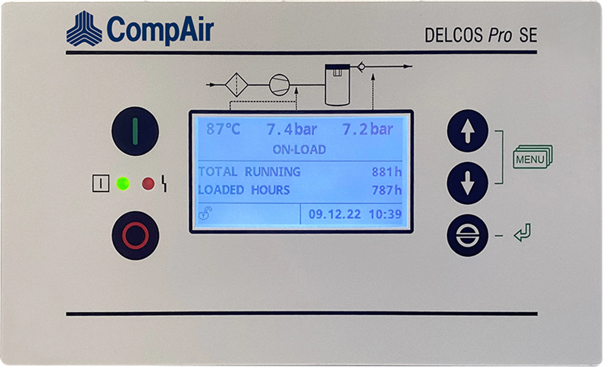 Система управління гарантує надійну роботу та зберігає інвестиції завдяки постійному відстеженню робочих параметрів. Delcos Pro SE також оснащений програмованими входами та виходами, може керувати додатковими пристроями та пропонує наступні функціональні можливості, представлені у вигляді розбірливого тексту на 2,8-дюймовому графічному дисплеї з сучасним інтерфейсом користувача: