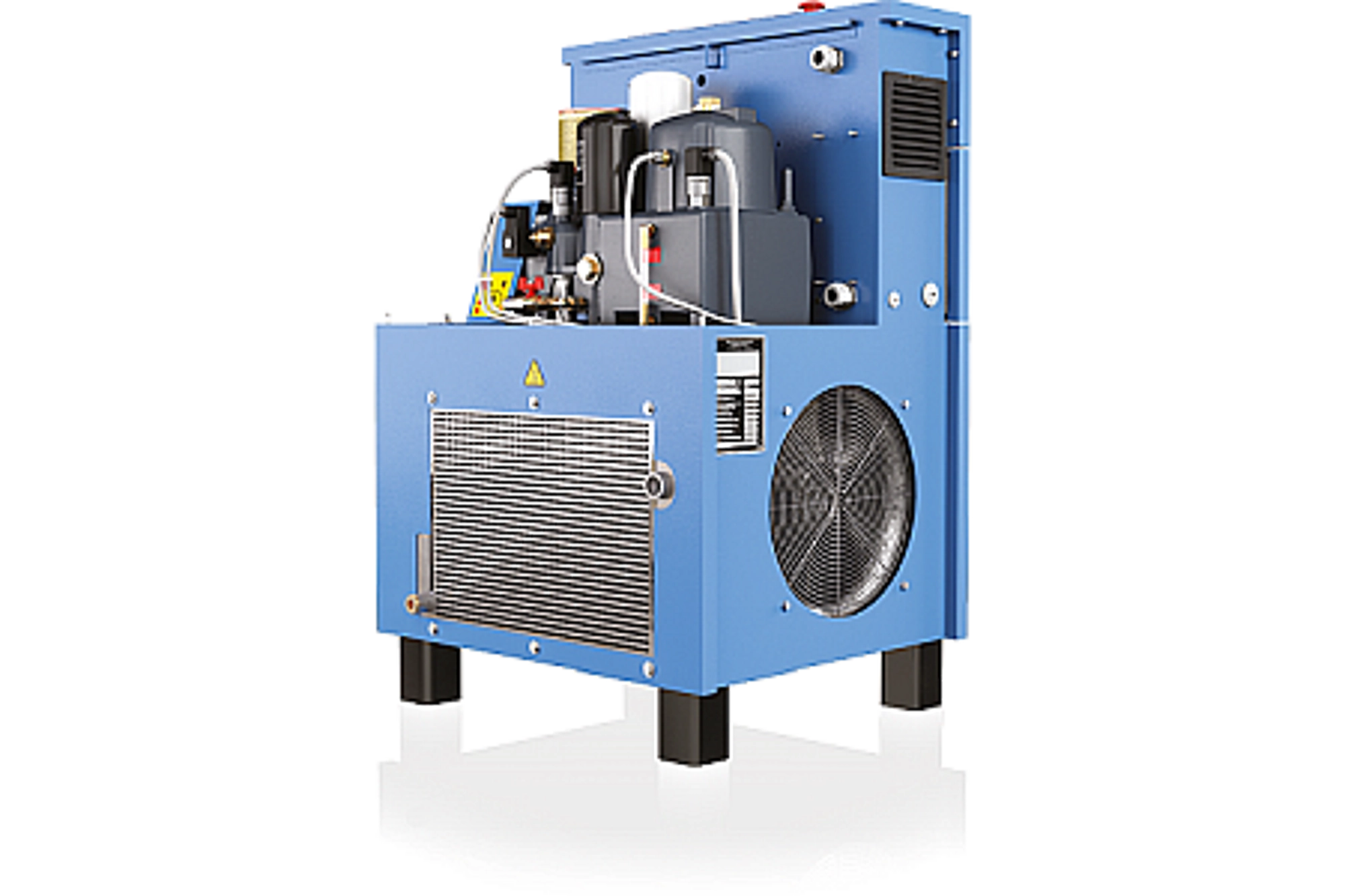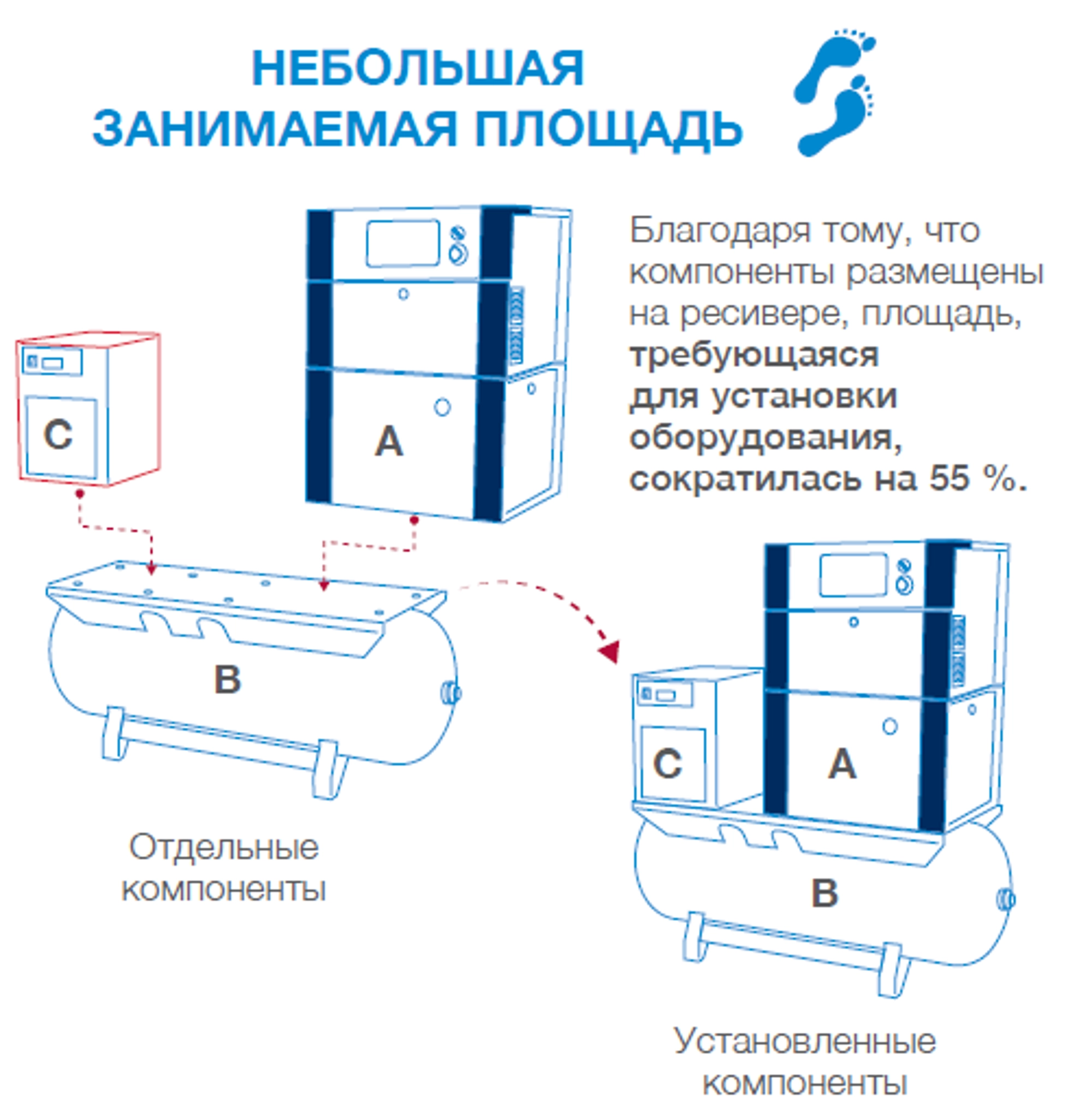 Автономні компресори мають дуже компактну конструкцію з площею основи, що не має собі рівних у цьому класі, — всього 0,4 м2. У поєднанні з осушувачем та ресивером з'являється можливість оптимізації займаної площі. Крім того, монтаж дуже простий.